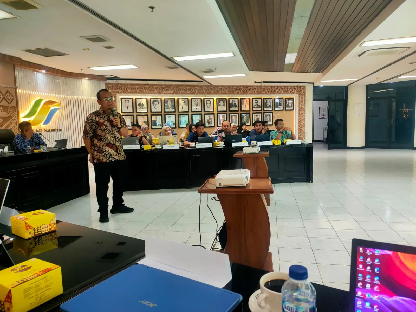 Sambutan kedua sekaligus nara sumber disampaikan oleh Kepala Divisi Manajemen Risiko dan Sustainability, Bapak Dian Wahyu, secara langsung dari Aula Harmoni. Dalam arahannya, beliau menegaskan bahwa penguatan fungsi manajemen risiko dan keberlanjutan (sustainability) harus berjalan selaras sebagai bagian dari strategi bisnis perusahaan. Ia juga menekankan pentingnya peran aktif seluruh unit kerja dalam mengidentifikasi, mengelola, dan memitigasi risiko secara sistematis guna menciptakan nilai tambah dan menjaga keberlangsungan usaha perusahaan.